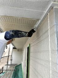 軒天も外壁とともに妻側のみ塗ってあるので、北面も軒天と外壁を塗って行きます。