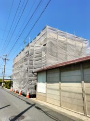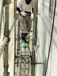 先日足場を建てたばかりの現場で、今日は高圧洗浄を行っています。