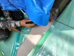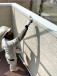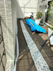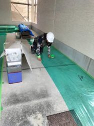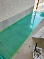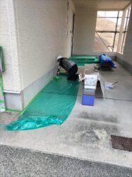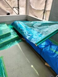 こちらも広い範囲ですが、外壁や笠木の塗装時に飛散するリスクがあるので、床をしっかり養生します。