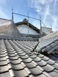日本瓦の屋根のこのお宅は、足場が組んであるとはいえ、現場を見るのも一苦労です。