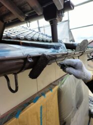 雨戸や養生が終わって、今日は雨樋の塗装を行っていました。