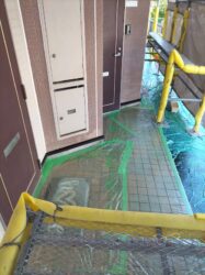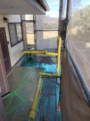 居住者の方が出入りに困らないように玄関前の部分は広めに足場が開けてあります。