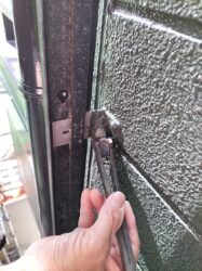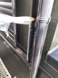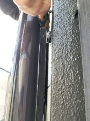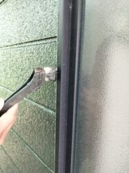 雨戸の枠の部分の養生を外しながら、テープの貼ってあった境目の部分
