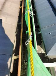 足場にくくりつけてある紐を一箇所ずつほどいて行く作業です。
