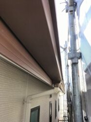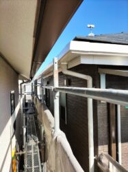 軒樋が大きいタイプなのもあり、足場のネットと接触しそうな距離です。