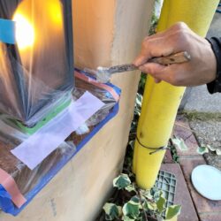今回、北側の玄関周りの柄は残すためクリア塗装を行う仕様になっています。