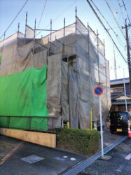 塗装を行っているときは、現場は足場とネットに囲われているためわかりにくいですが、
