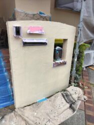 今日の作業は、ベランダのトップコートと塀塗装、付帯部の上塗り作業です。