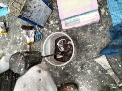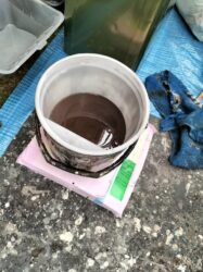 休憩に入る前に次の作業の付帯部に使用する塗料の準備を始めました。