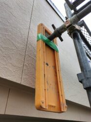 外壁の塗装時に、足場の壁抑えは塗装の邪魔になるのでジャッキを壁から離してあります。