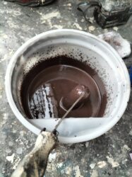 主材と硬化剤と、シンナーをバケツに入れるとしっかりと機械を使って撹拌していきます。